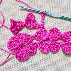 Remove the hook, insert it into the 4th Ch of the 1st Petal of the next flower. Grab the dropped loop with your hook and pull it through the St.